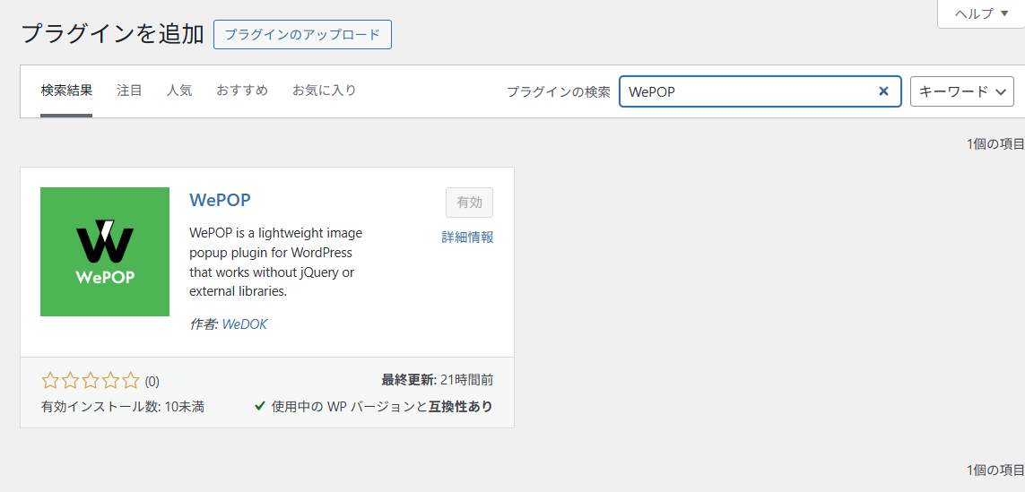 - 表示された「WePOP」プラグインを「今すぐインストール」→「有効化」